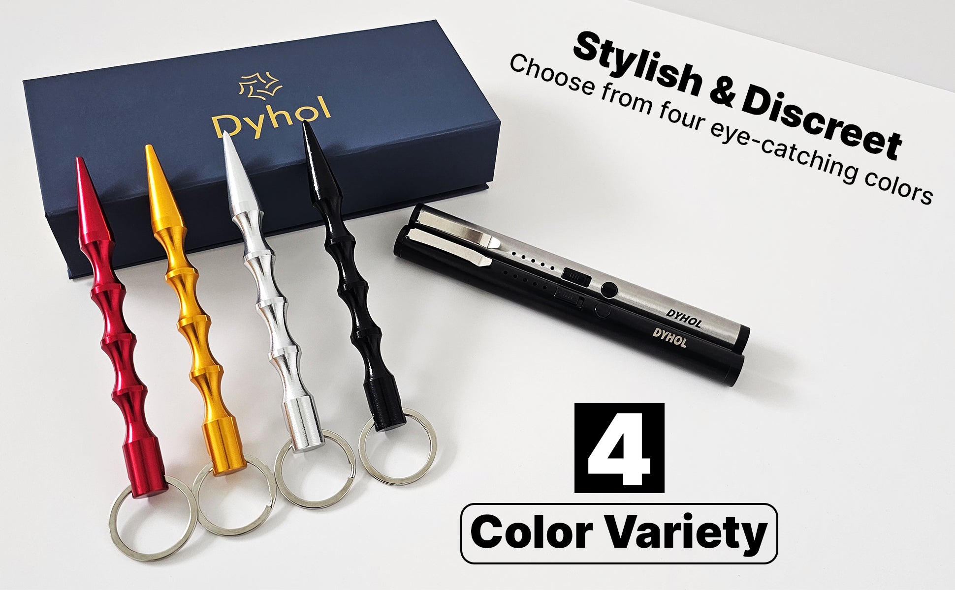 Stylish aluminum safety stick keychains in black, silver, gold, and red. Lightweight, durable, compact design for everyday safety and emergencies.