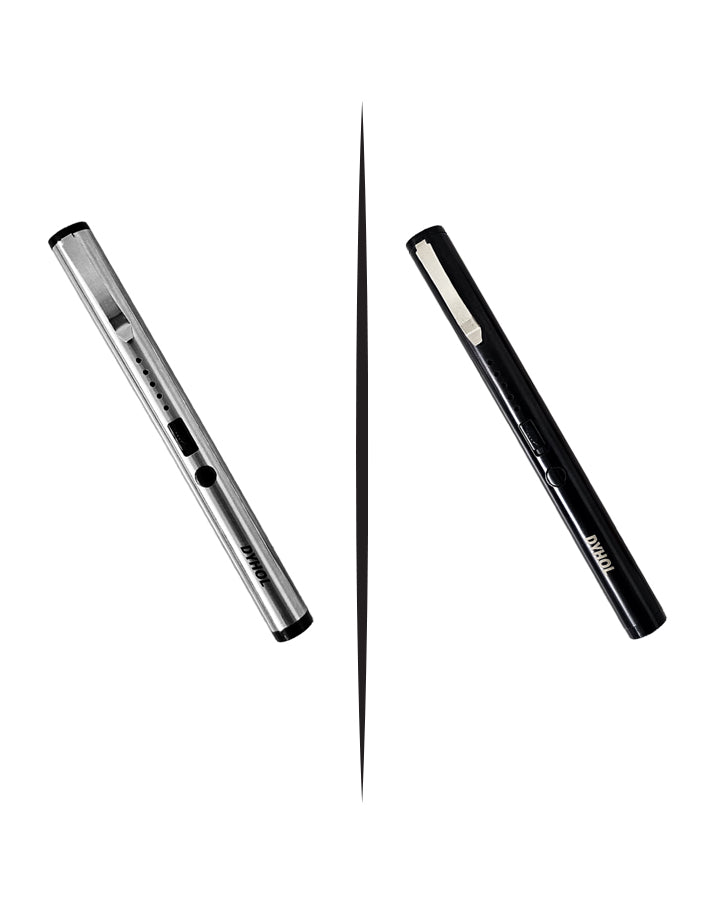 Sleek stainless steel and black mini stun device, compact 6-inch design with discreet pen-style look, reliable rechargeable personal safety accessory.